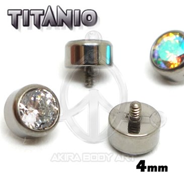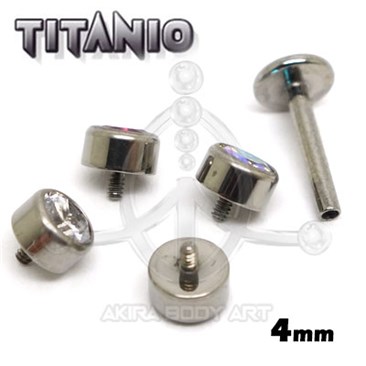 Repuesto fabricado en titanio de rosca interna; Titanio G23; diseño joya 4 colores (blanco, tricolor, celeste y rosa). Rosca de 0,9 mm. Medida joya: 4 mm.