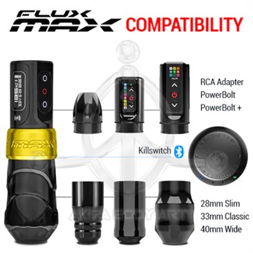 Máquina Rotativa Spektra FLUX MAX de FK Irons. Conexión de carga USB-C; recorrido, profundidad de aguja y eGive (elasticidad) completamente ajustables. Duración de batería: 10 horas (Según uso).