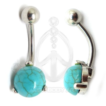 Banana de ombligo étnica con barra de acero y bola PIEDRA DE AZULITA engarzada. Dimensiones barra: 1.6x10 mm. Bola superior: 5 mm. Motivo inferior: 8 mm.