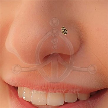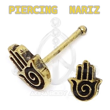 Nostril para nariz, fabricado en latón. Adorno: Mano de Fátima. Medida barra: 0,8 x 7 mm. Medida motivo: 4,7 x 5,7 mm.