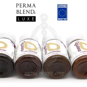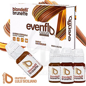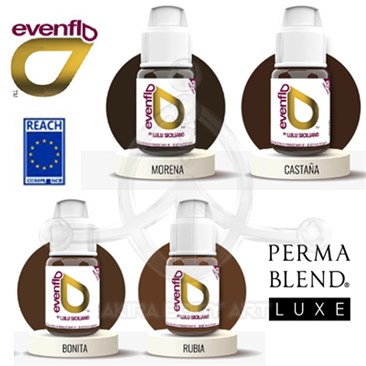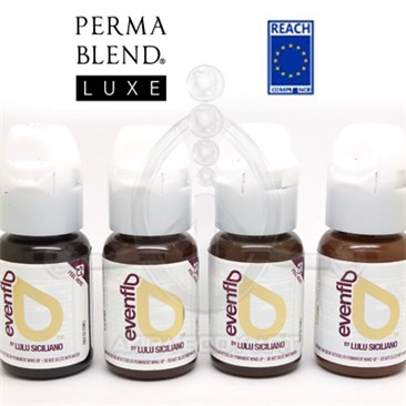 Set de pigmentos EVENFLO by Lulu Siciliano fabricado por Perma Blend Luxe para técnicas de corrección en simulador; 4 botes de 15ml. Colores diseñados para técnicas sobre simulador de cejas.