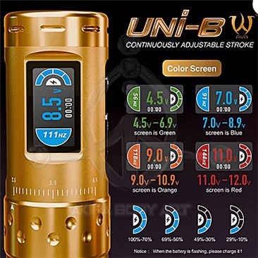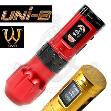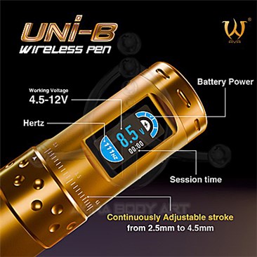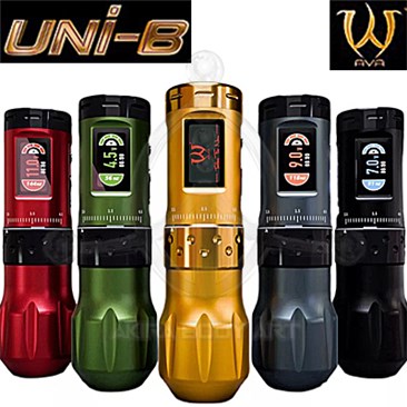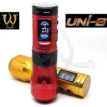 Máquina inalámbrica tipo pen de AVA, modelo UNI-B. Stroke regulable de 2,5 mm a 4,5 mm. Pantalla en color HD con temporizador, voltaje, carga y hertzios. Funcion de rebote para dañar menos cada tipo de piel. Grip antideslizante. Medidas: 128 mm X 38 mm.