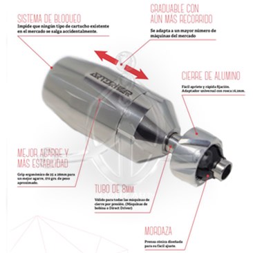 - Adaptador universal* incluido con cierre de aluminio, especialmente diseñado para adaptarse a cualquier tipo de máquina del mercado, con rosca de 16.1 y mordaza cónica de fácil ajuste.